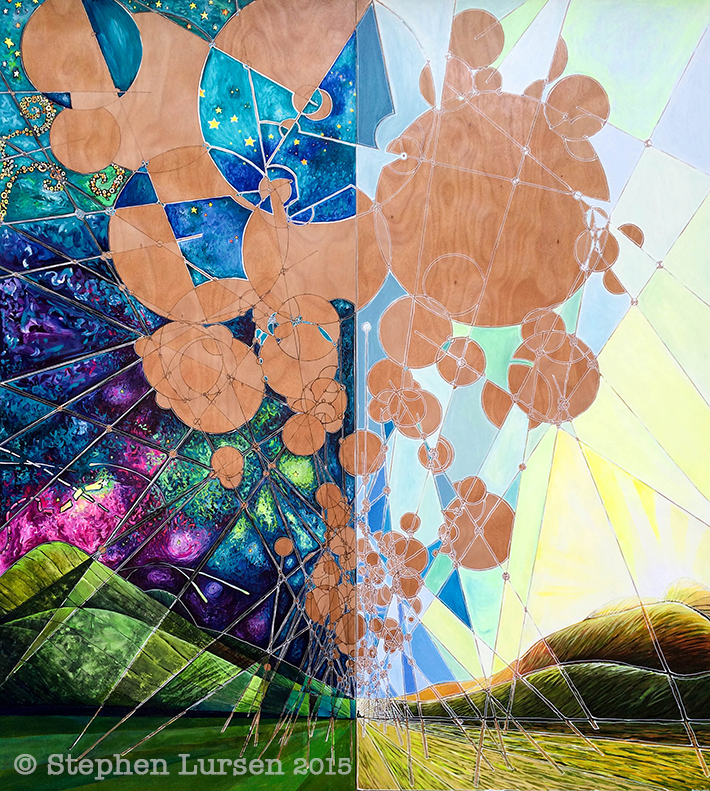 "Expecting Glory" - This painting is about how a person can walk through life and experience hardship and beauty and after a day is over hope rises from within expecting a glorious new day to come. The left half of the painting is a night scene and represents the past. The right half of the painting is a sunrise and represents what is to come. The tiny figure in the bottom center represents every person on an individual level. The circles rising from the figure represents hopes and dreams for the future. The longer we focus on a dream the bigger it can become and when we allow the cares of this life to distract us from our dreams, they begin to fragment and fall apart. The original painting is 7'x6' acrylic on 2 wooden panels.